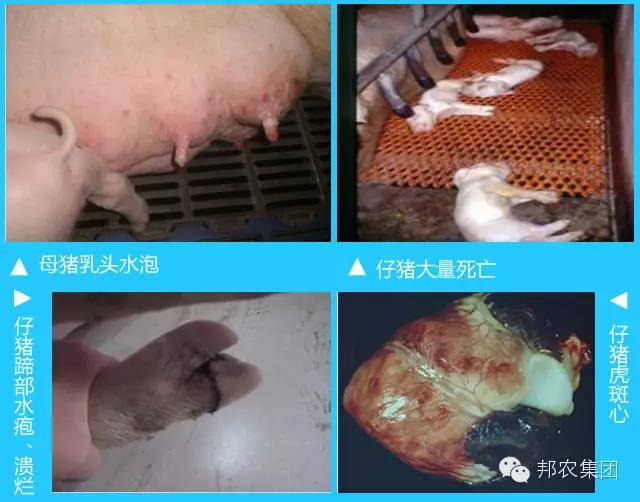 仔豬表現(xiàn)為(wèi)嗜睡(shuì)$α,眼睑腫脹,分(fēn)泌物(wù)增多(duō),精神±€沉郁,呼吸頻(pín)率加快(kuài)λ★,個(gè)别仔豬有(yǒu)肌肉震顫現(xiàn)象,部•>₩分(fēn)仔豬死亡速度非常快(kuài),大σ≈ &(dà)約3-5分(fēn)鐘(zhōng),臨死表現 '>(xiàn)為(wèi)突然倒地(dì),四肢€÷劃水(shuǐ)狀,頭部僵直,死亡後口吐白(b∑ ≥ái)沫,身(shēn)體(tǐ)蒼白(bái)。11Ω±♠月(yuè)23日(rì)之後仔豬出現(xiàn)明(míng)顯口蹄疫症>γ∑狀,蹄部和(hé)鼻部出現(xiàn)水(sh€ ↑γuǐ)泡,大(dà)量死亡仔豬解剖可(k¥♥ě)見(jiàn)虎斑心。
